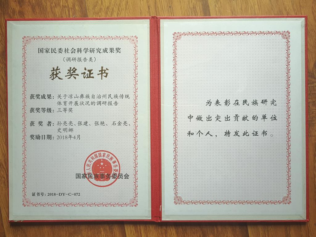 近日,国家民委2017年度全国民族工作优秀调研报告评选结果揭晓。我院孙亮亮副教授带领研究团队完成的《关于凉山彝族自治州民族传统体育开展状况的调研报告》,荣获国家民委社会科学研究成果奖(调研报告类)三等奖。
