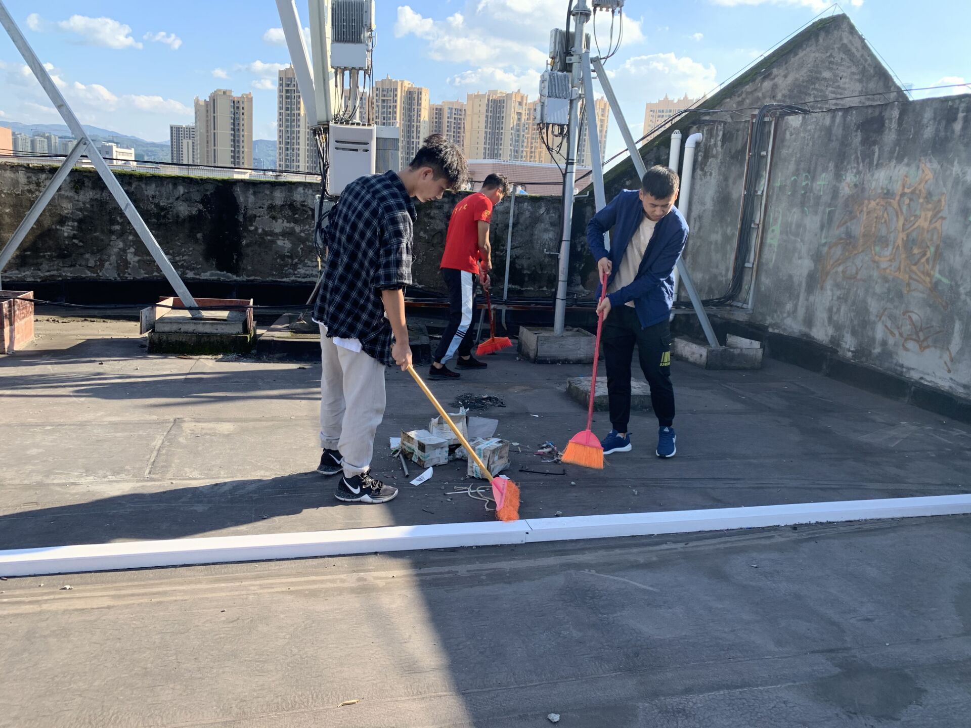 KY开元集团官网由马思远老师带队,劳生部带领KY开元集团官网劳动志愿者分组对九舍进行清洁,主要针对公寓天台、楼道、走廊、学习室窗户、消防栓等边边角角进行排查,清扫。坚决做到地面无垃圾,无积水,过道墙砖明亮干净,无小广告等。同时,大力宣传“四城同创”和文明公寓的工作要求,倡导大家共建共享更加美好生活的环境。