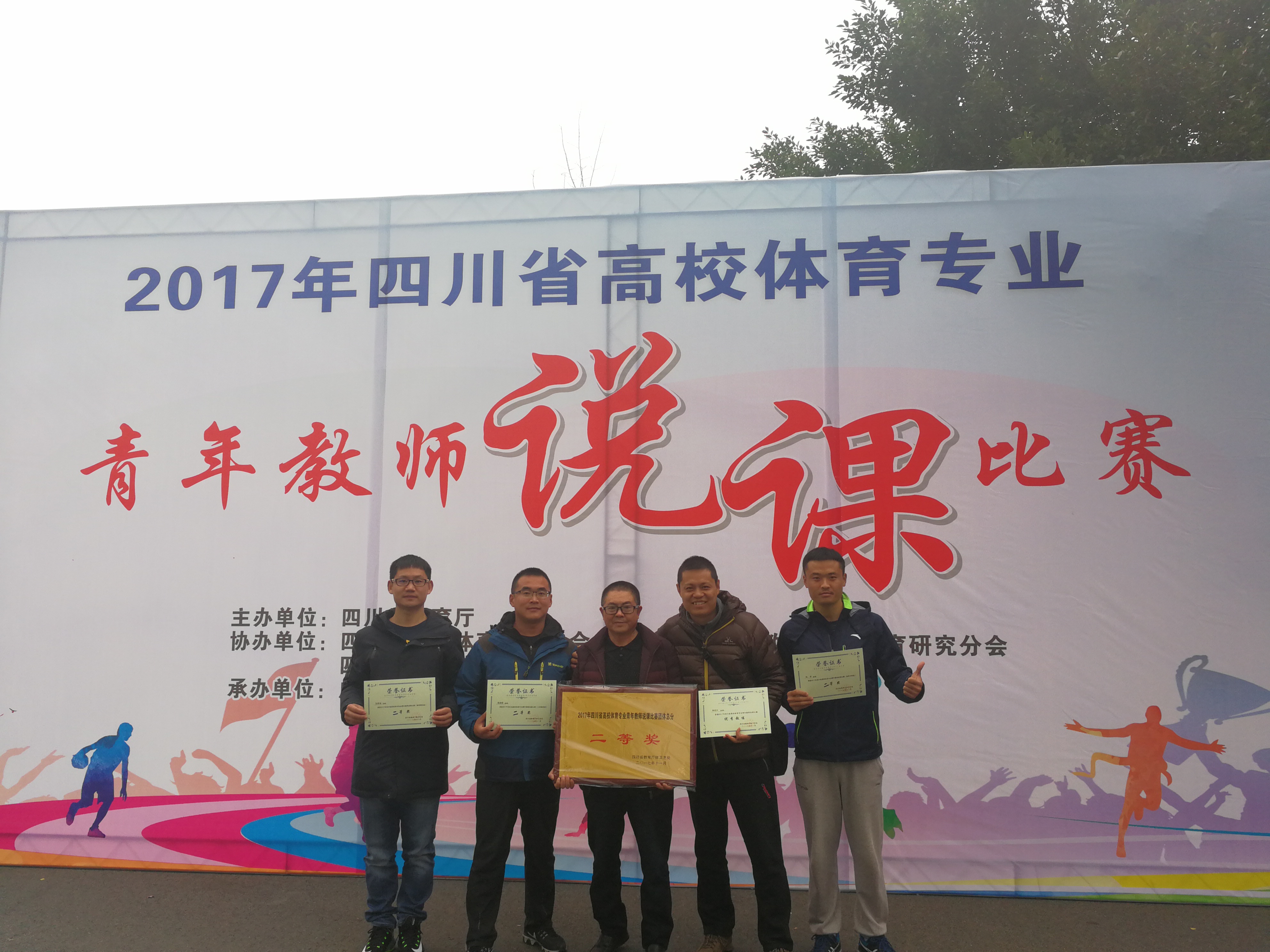 20171123日至25日,2017年四川省高校体育专业青年教师说课比赛在成都师范学院举行。我院三名青年教师刘宇、张岩松、马思远分别获得个人二等奖,团体获二等奖,成绩较以往有了重大突破。