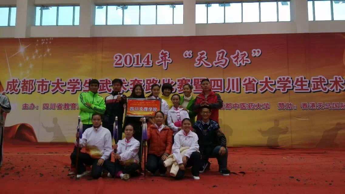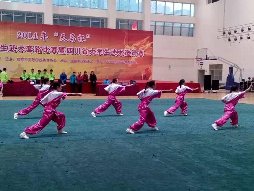 2014年11月27日11月29日2014年“天马杯”成都市大学生武术套路比赛暨四川省大学生武术邀请赛在成都市中医药大学体育馆隆重举行。我校参赛队凭借扎实的武术功底,在比赛中荣获集体奖项四项、个人奖项七项的佳绩。