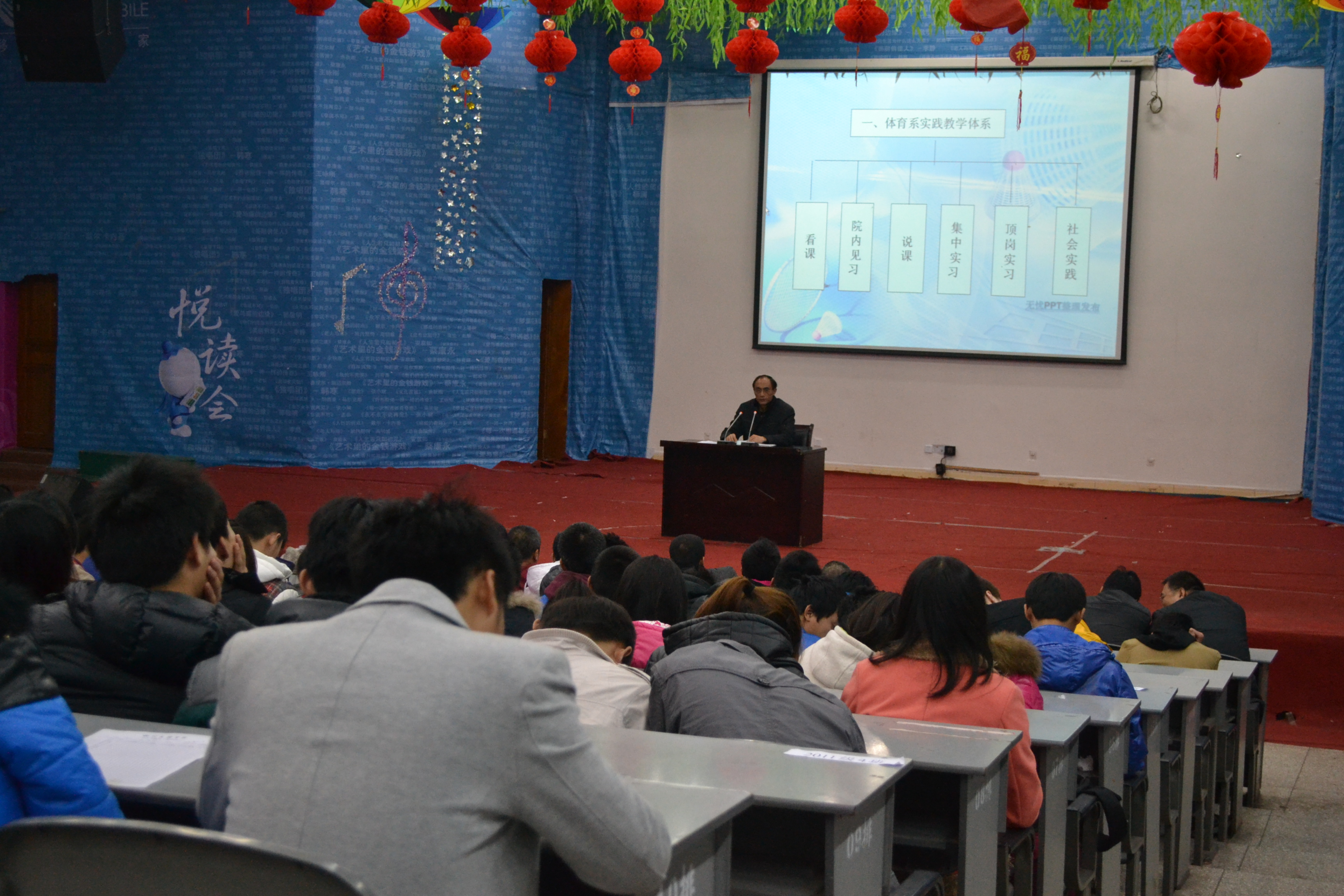 2012年12月10日晚7点,陈碧述教授在KY开元集团官网莲湖校区126教室作题为“抓好实践教学 夯实就业基础”的学术讲座。本次讲座由体育系主任董立教授主持,体育系部分教师及300余名学生到场聆听。