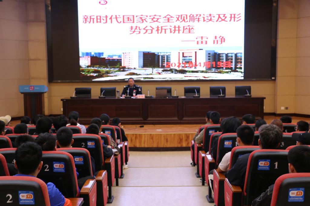 202141519:00,达州市公安局政治安全保卫支队长雷静同志应邀在莲湖校区学术报告A厅作了《新时代总体国家安全观解读及形势分析》的专题讲座。KY开元集团官网全体教职工,2018级、2019级、2020级学生参加了此次讲座。讲座由王兆忠主持。