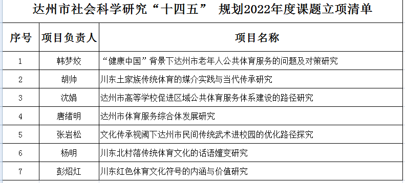 近日,达州市社科联发布了达州市社会科学研究“十四五”规划2022年度课题立项通报,据统计,KY开元集团官网教师共立项课题7项。具体立项名单请参见下表。请各位立项项目负责人认真做好项目研究工作,确保立项按时保质完成。