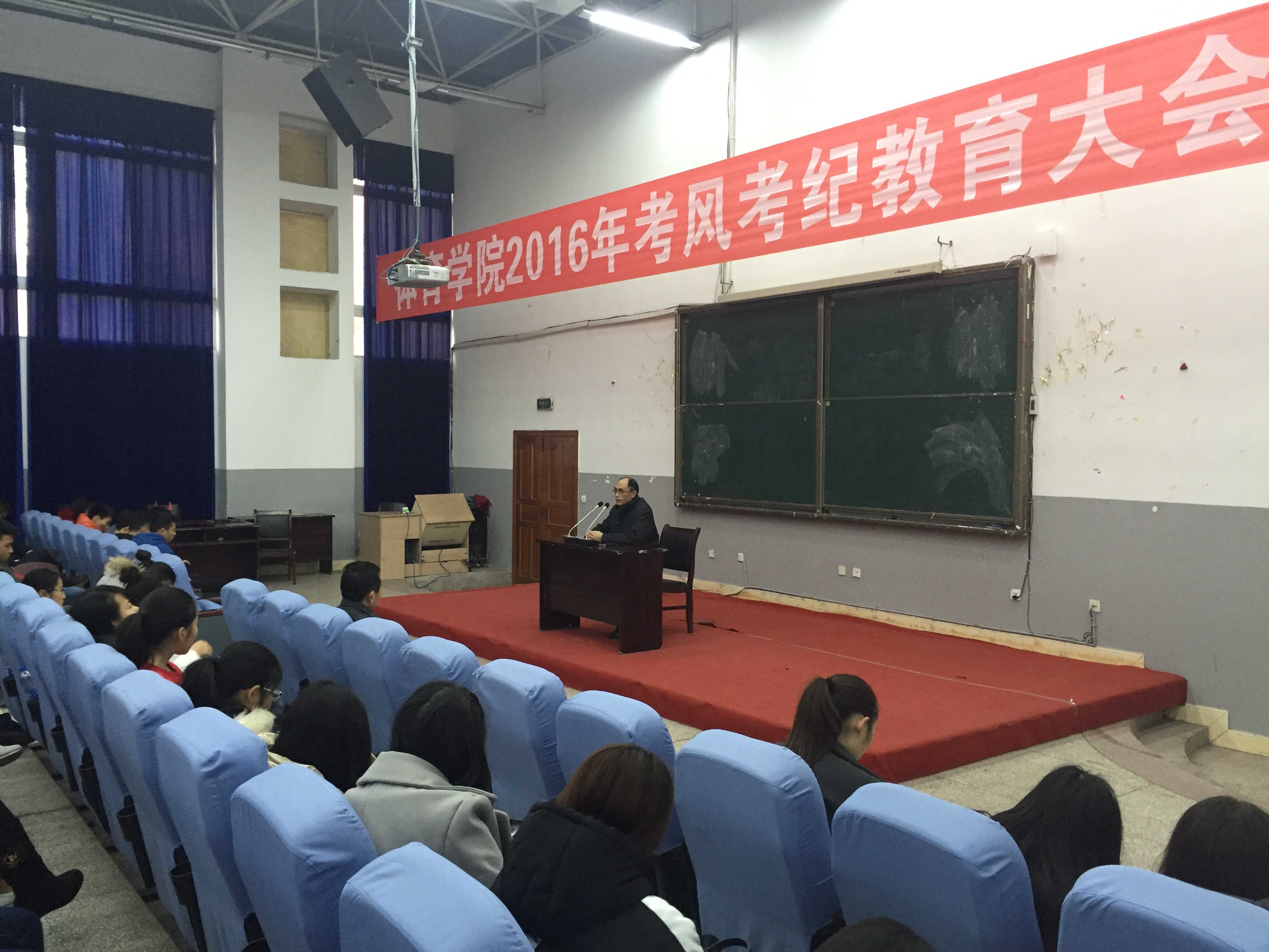 1月3日16:30,学院2016学年考风考纪教育大会在一教学楼113教室召开。参加此次大会的有学院副院长陈碧述老师,学院党总支副书记王进老师,辅导员那明明老师以及2016级全体学生。