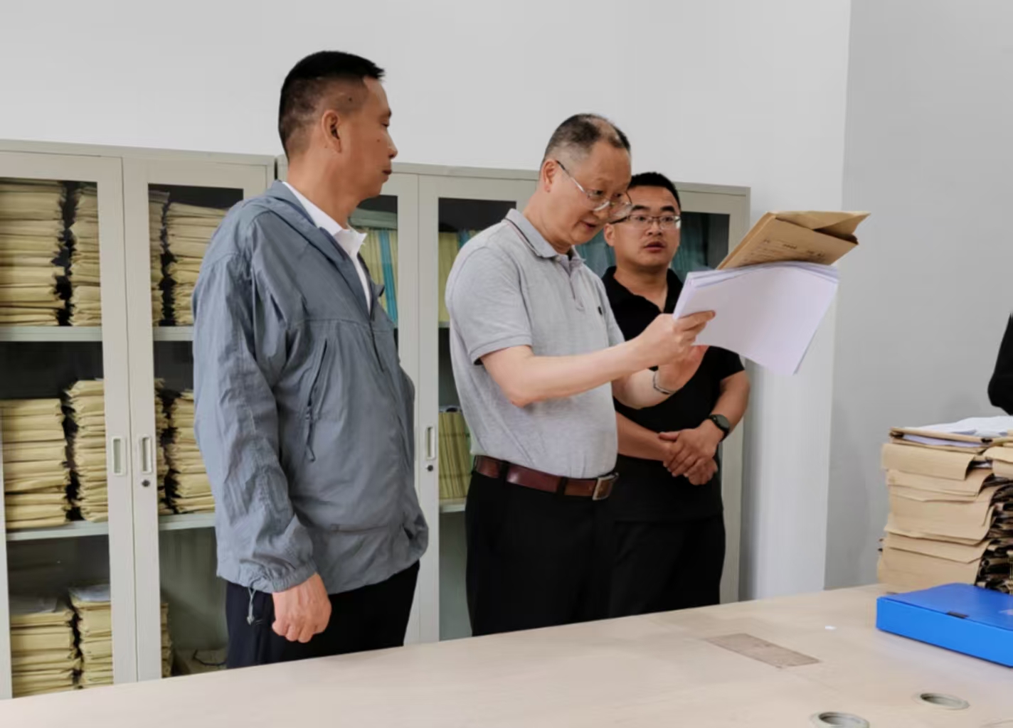 熊兴中首先到本科教育审核评估资料室,询问了本科教育教学审核评估相关材料的准备情况,现场查阅了毕业论文、试卷、等材料,并结合审核评估要求,从规范性、严谨性、完整性等方面,提出了针对性指导意见。