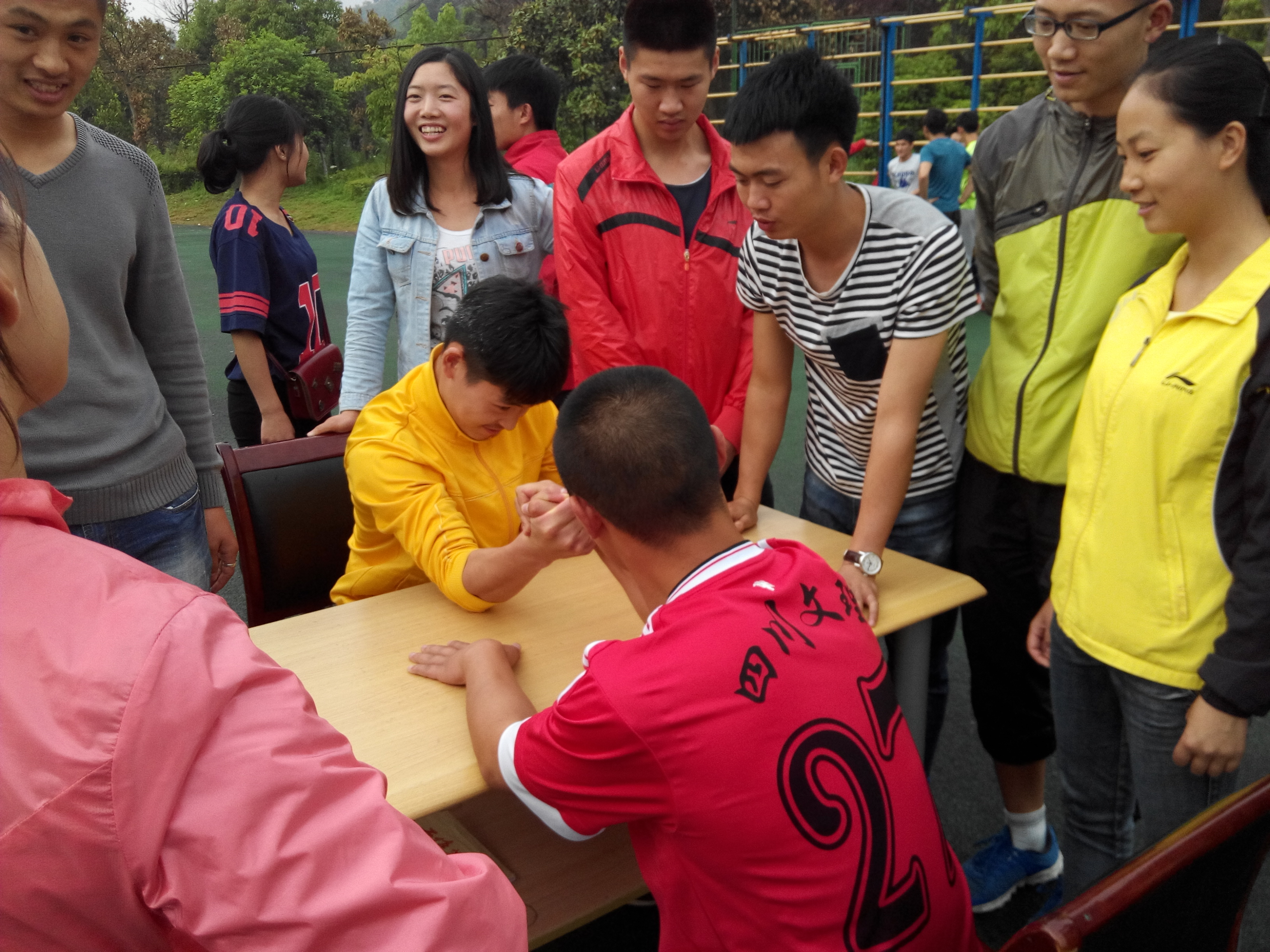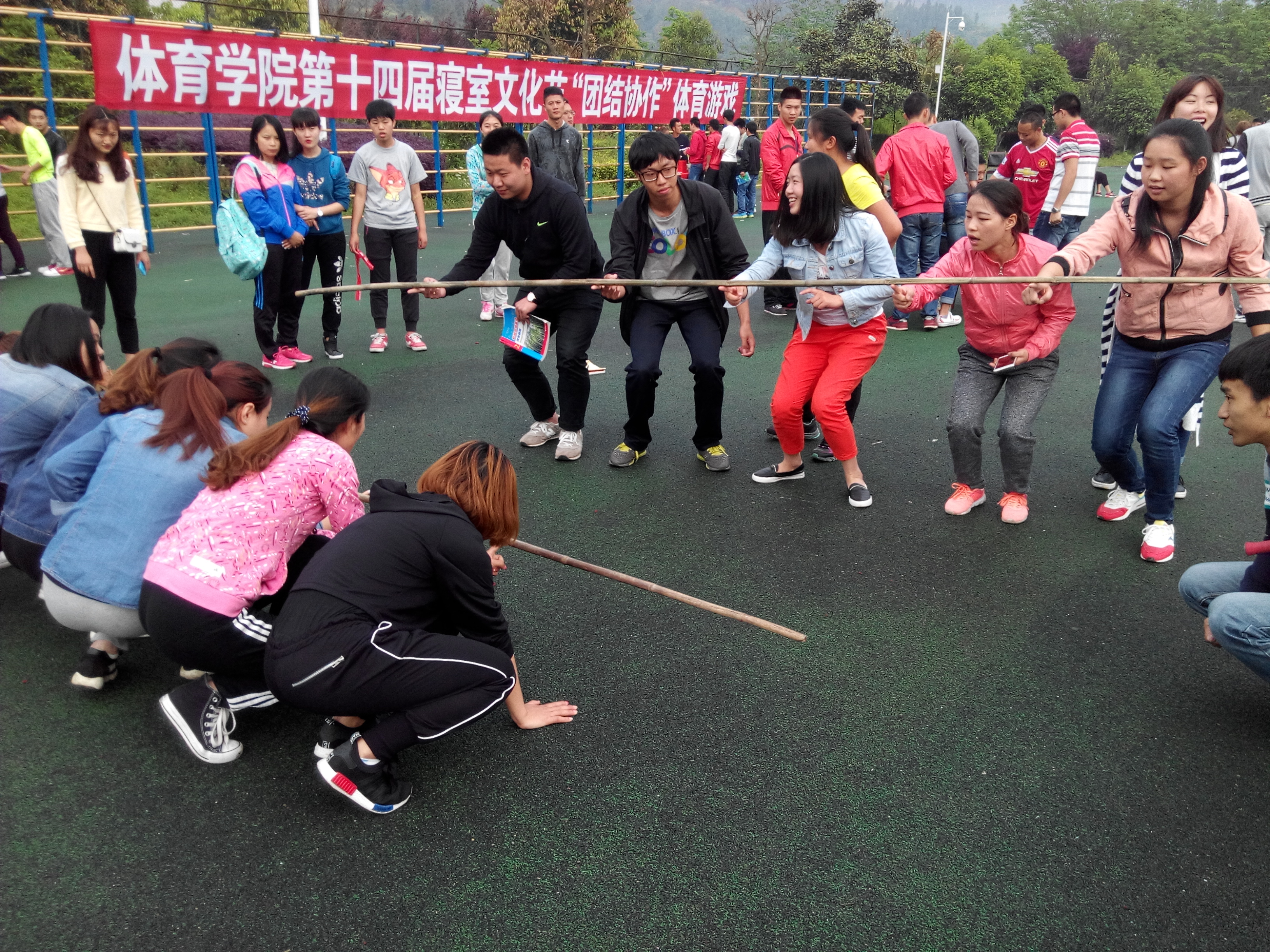 4月21日下午17:00,我院在田径场举行了第十届寝室文化节“团队协作”体育游戏活动,其中扳手腕、齐眉棍、袋鼠跳、十人九足、过电网等游戏深受学生的喜爱。本次还为学生准备了实用性较强的精美小礼品,学生以集奖券的形式领取小礼品。