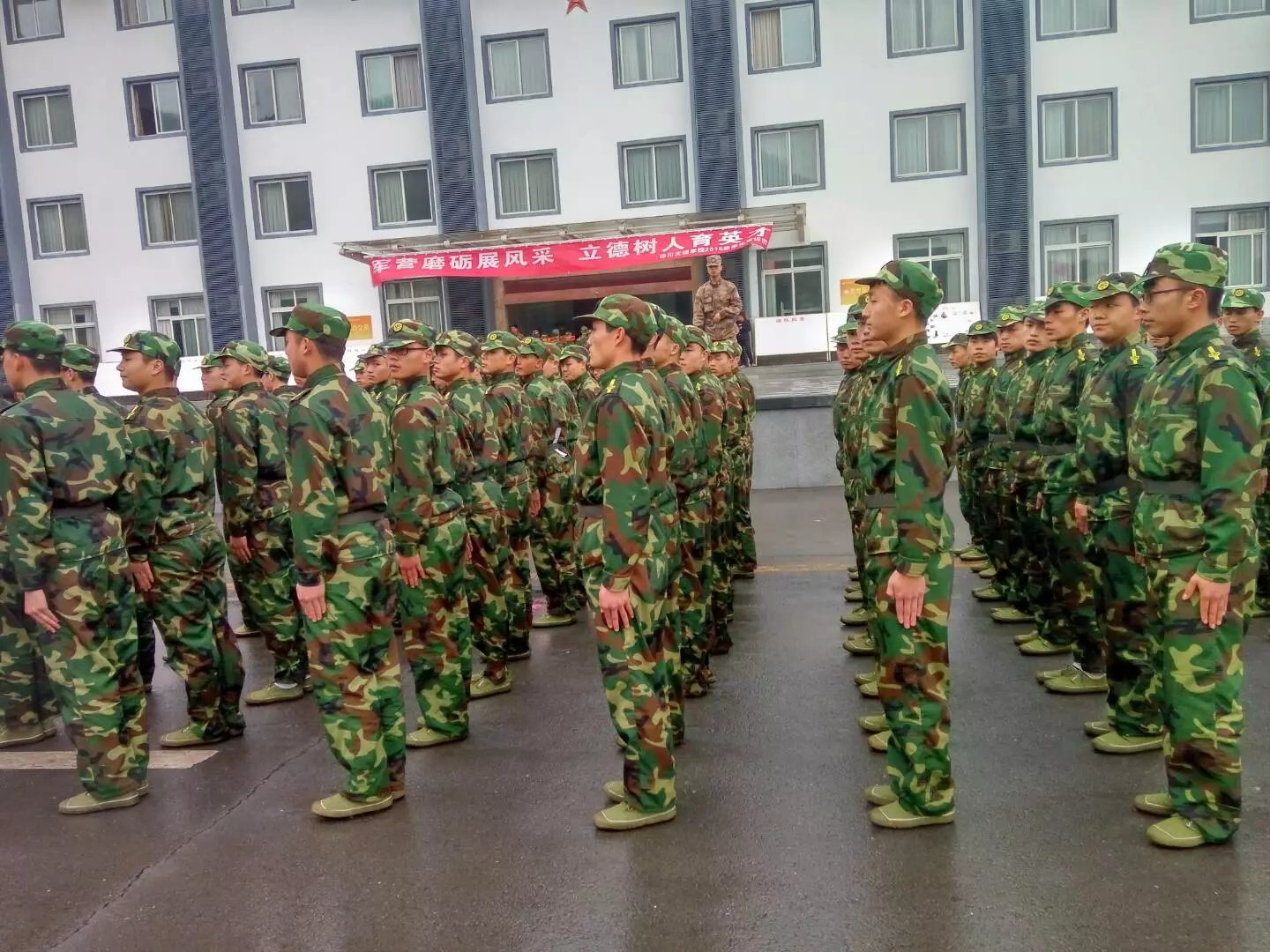 学院16级新生的军训已经进行了两天。阴雨绵绵的天气为同学们的训练带来了些许的不便,但在水滑的地面和橄榄绿的迷彩军装相互辉映,同学们显得活力十足。军官们严格要求新生整理军容和端正军姿,不时亲自示范,并手把手纠正基本的动作,同学们在军官的带领下认真训练,没有丝毫懈怠。