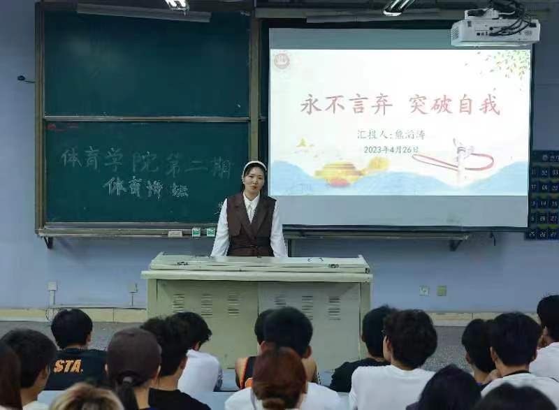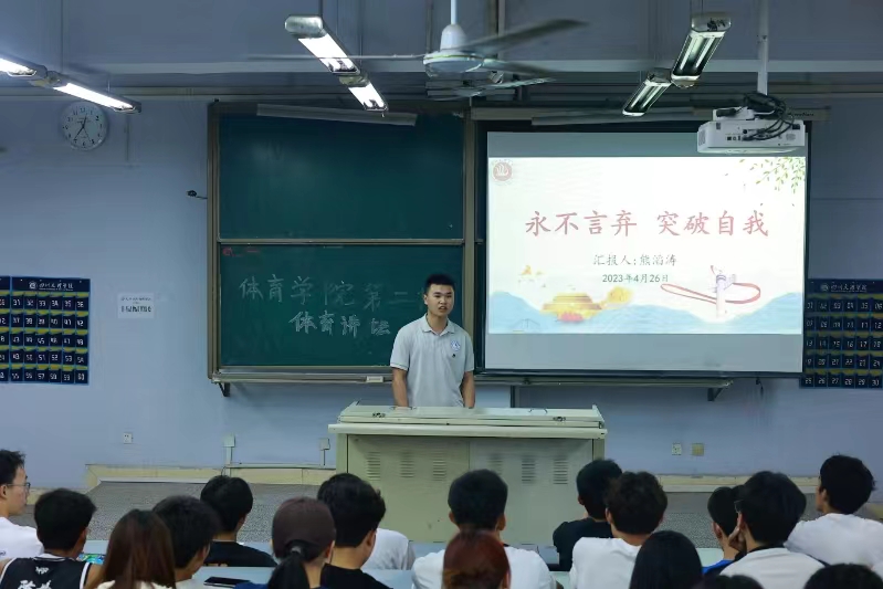 熊滔涛以“永不言弃,突破自我”为主题,分享了自己的学习和工作经验。他谈到我们应当调整心态、找准方向、确立目标、享受孤独。随后,其就“我为什么选择体育”与同学们进行了互动交流,并强调了规划好自己大学生涯的重要性。